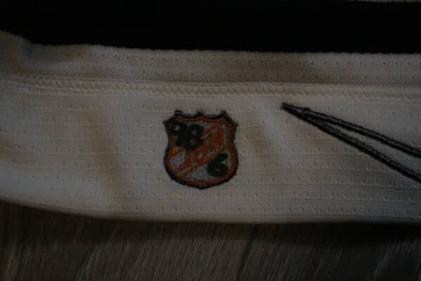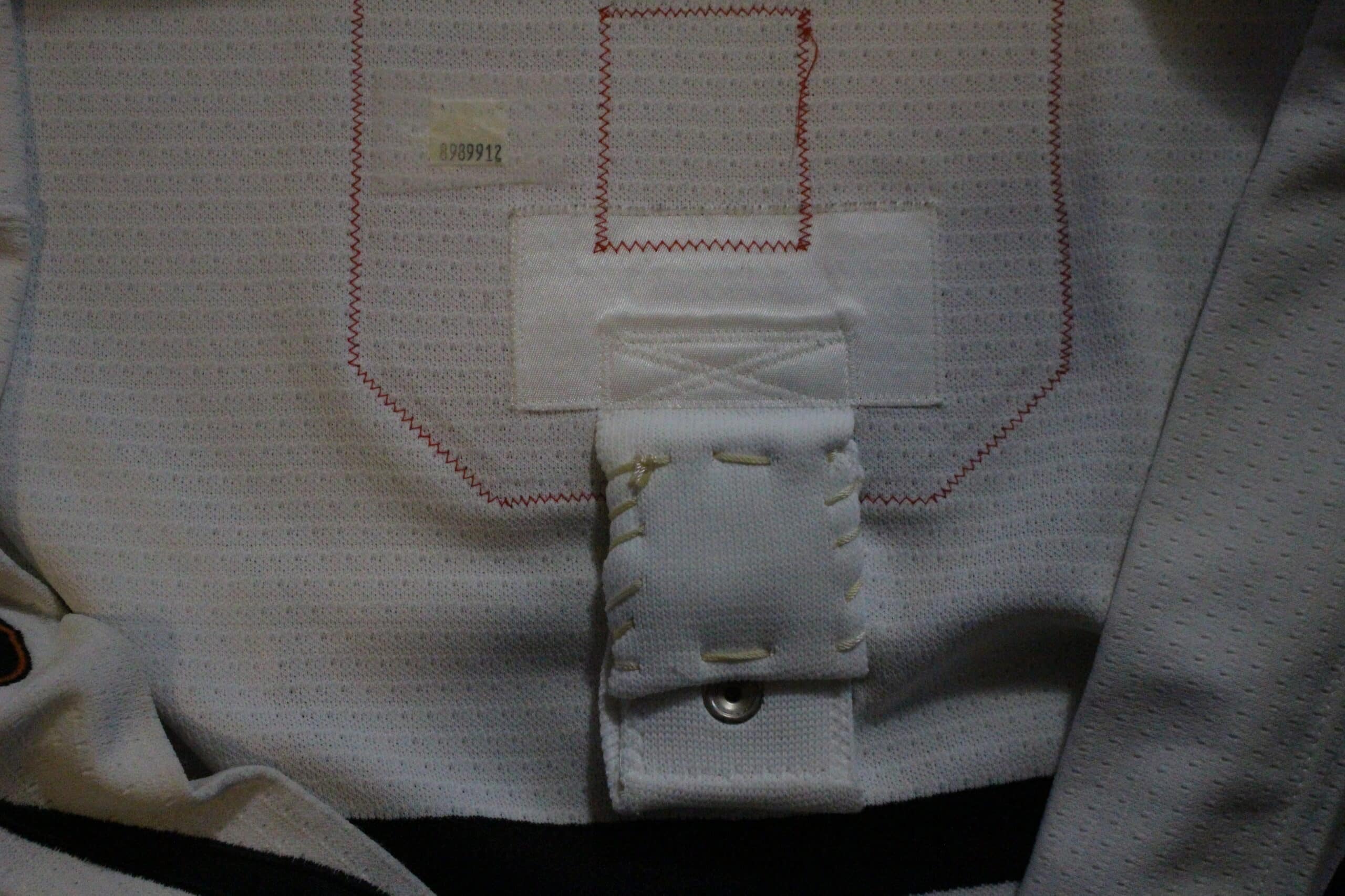 This jersey has light wear on the front body by the crest and on the hem. There is slight discoloration on the shoulders. There are small fabric snags throughout the jersey from use. Inside the hem on the NHL shield is the number 98/6. Near the fight strap, ironed on the jersey is a identifier numbered 8989912. An LOA from J&J Distributing will be included. It references the incorrect years, however the authenticity indicators are correct.